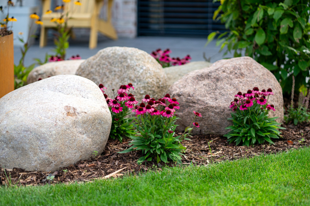 Ein besonderes Highlight: große, rostende Stahlringe, die im Garten wie skulpturale Kunstwerke wirken – mal Rahmen, mal Durchblick, mal Kontrast. Dazu massive Felsen aus Dänemark, kraftvoll und nordisch, gezielt platziert zwischen Stauden und Gräsern.
