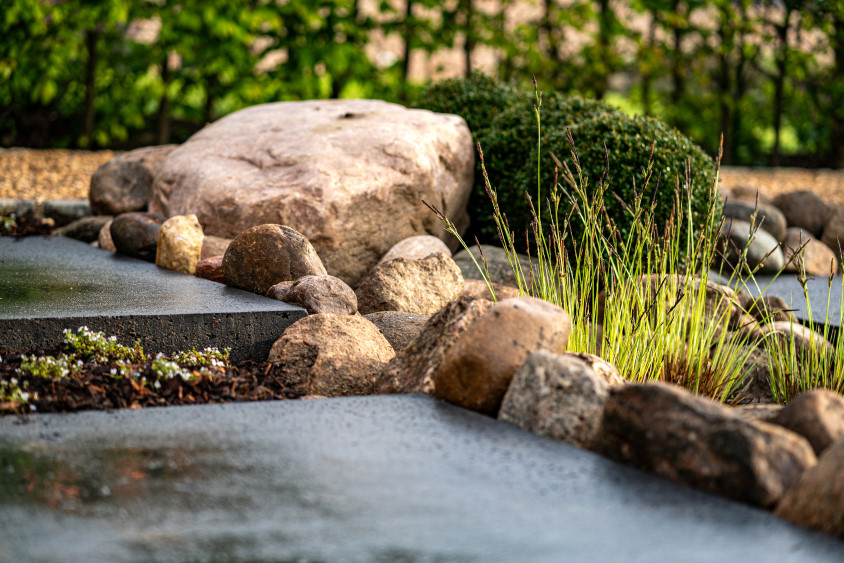 Rund um das Wasser wurde mit Bedacht bepflanzt – Stauden, Gräser, Gehölze. Mal zurückhaltend, mal farbenfroh. Immer mit dem Ziel, das Gesamtbild harmonisch, lebendig und doch ruhig wirken zu lassen.